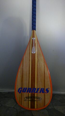 今年のガナーズのパドルです。ブレードが一回り大きいタヒチアンサイズです。 隣が現在15本追加でオーダーいただいた消防署チームのパドルです。