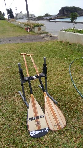奄美大島からSUPとアウトリガーパドルオーダーしてくれました。もうすぐ着きますよ。 表の黒い部分は、カーボンシートです。SUPやカヌーのステアでぶつけて破損しやすい箇所に貼っています。 裏面もカーボン仕上げでサンドイッチしていると強度は格段に上がります。